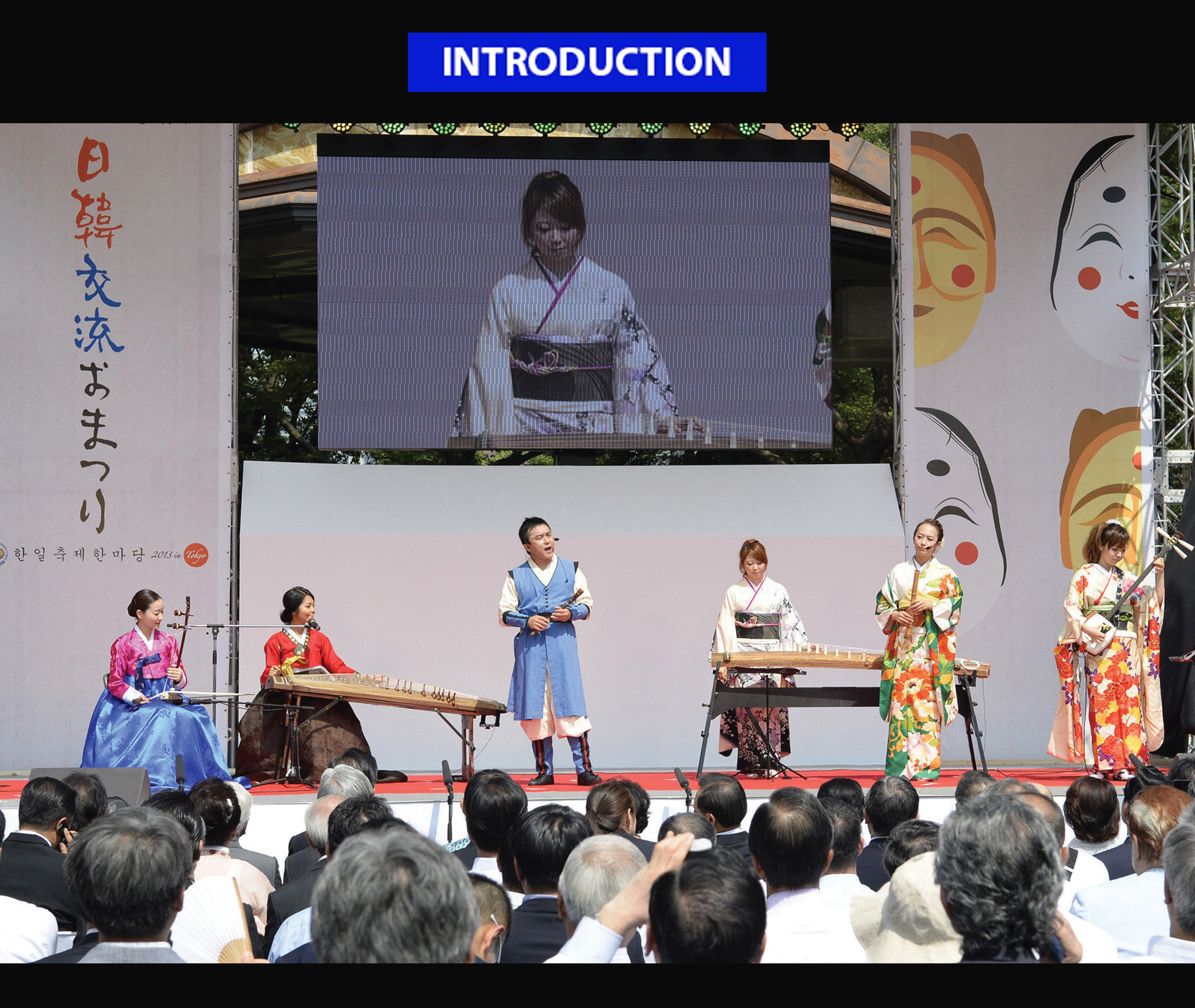A lot of pop music we listen to has its origins in traditional music. In this picture of a Korean and Japanese music festival, we can see some traditional instruments.